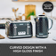 Add eye-catching finishing touches to your kitchen with the Breville Curve Collection, featuring a unique curved texture design with high gloss finish and chrome accents, as well as illuminated controls for ease of use. This Breville toaster looks stylish and also handles the basics with ease. The deep, variable width slots accommodate different bread sizes, crumpets and bagels, while the variable browning controls ensure every slice is just the way you like it. Remove smaller slices without burning fingers with the High Lift facility. A removable crumb tray and cord storage helps keep your worktop clean and tidy.