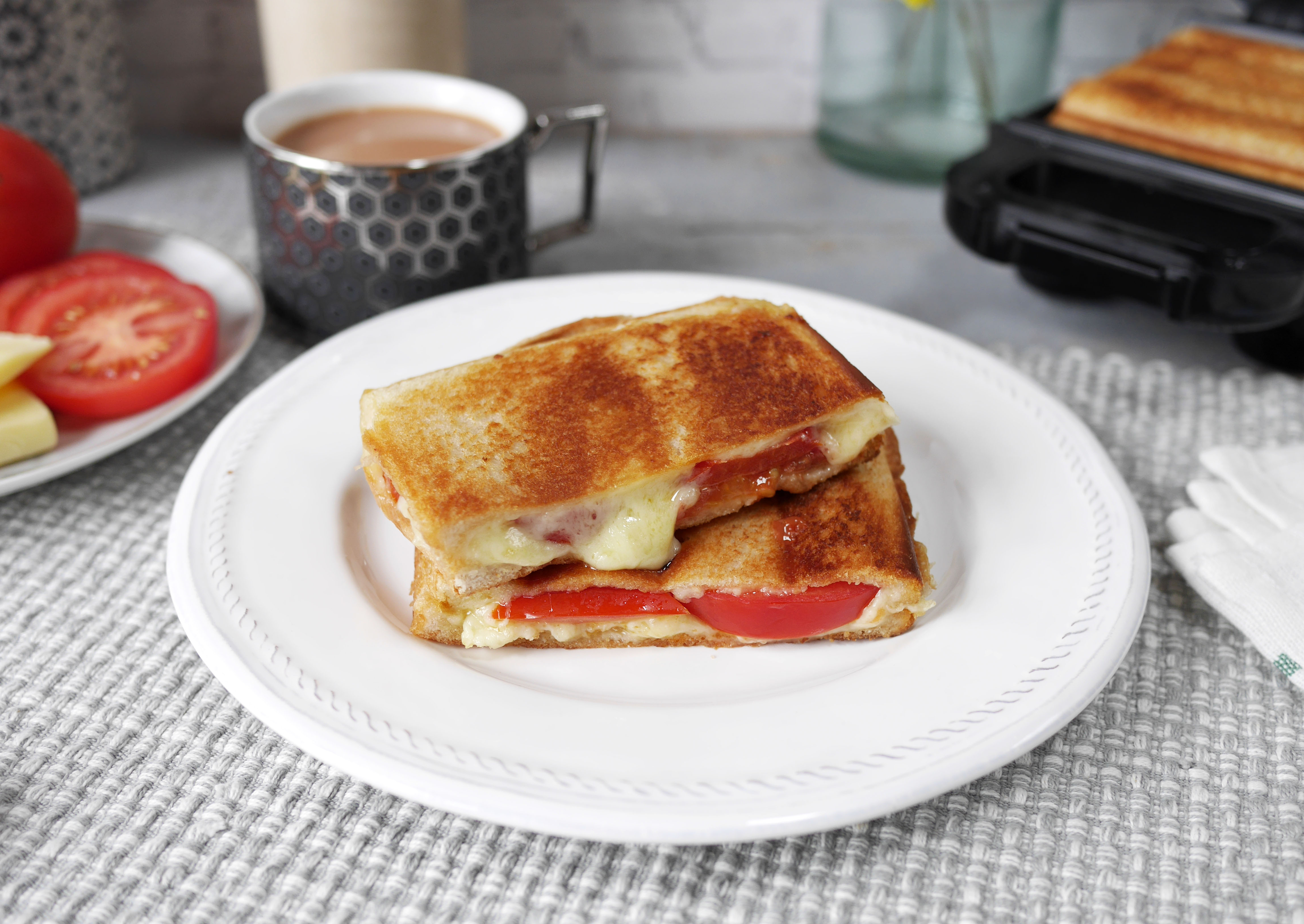 Preheat your Solo SnackMaster. Butter both slices of the bread on 1 side only. Turn this over so that the butter is on the outside of the bread. Assemble your sandwich, adding the cheese and tomato slices. Top with the remaining bread slice, buttered side to the outside and cook until crisp for approx 4-5 mins.